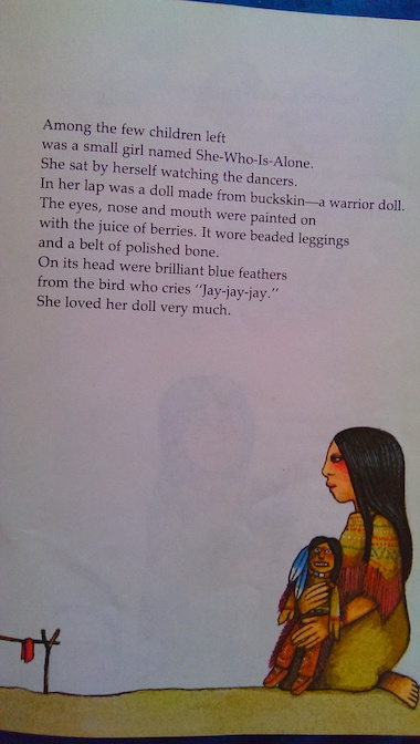 The people debate about who is supposed to make the sacrifice and what object the spirits could want, but one young girl thinks that the spirits are talking about her and her doll. The girl is called She-Who-Is-Alone because she is the last of her family. Her parents and grandparents are dead, victims of the famine. The only thing she has left to remind her of them is her doll, a warrior with blue feathers in its hair, that her parents made for her before they died.