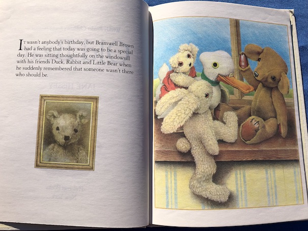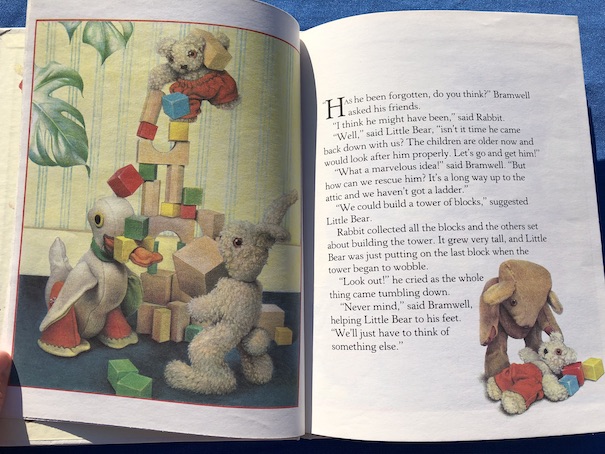 I remember my mother reading this book to me when I was a young child in the 1980s! One of the things that I like about this book is the detailed pictures. The textures on the stuffed animals are excellent, giving readers the feeling that they could reach into the book and touch the fluffy Little Bear, Bramwell’s paws (which look like they’re made of vinyl), and the Duck, who looks like he’s made of felt. The stuffed animals’ schemes to reach the attic are also fun and clever, using other children’s toys.