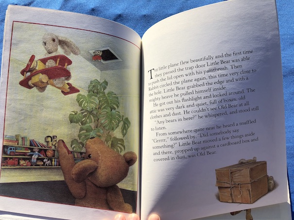 Eventually, they are successful when they use a toy airplane. After Little Bear finds Old Bear in the attic, they use parachutes made of handkerchiefs to parachute back into the playroom to rejoin the other stuffed animals.