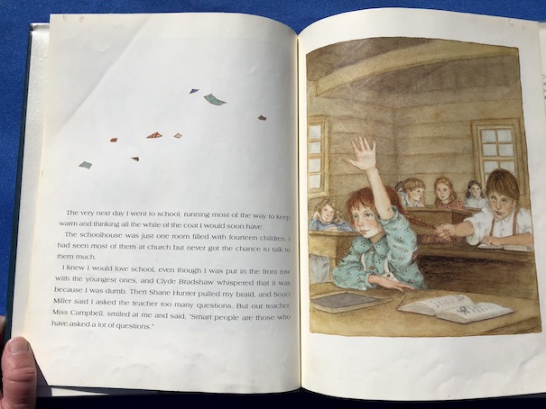 Minna starts going to school and does well, although she gets some teasing because, as a new student who has never been to school before, she has to sit with the youngest children, and Shane pulls her braid. Something that Minna particularly likes at school is Sharing Day (what my school always called “Show and Tell”), where students are given the chance to show special things to the class and talk about them. Minna decides that when her coat is ready, she will show it to the class during Sharing Day.