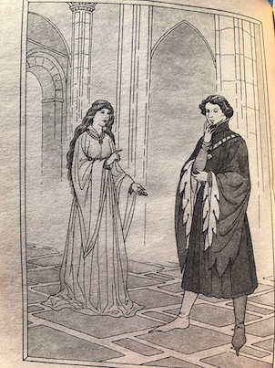 To Rosamund’s surprise, the prince falls in love with her beauty at first sight. She also impresses him with her intelligence when she tells him that she knows what no one else does, that he is actually very lonely. (Which is natural, since he thinks that no one can be his equal or true companion.) Although she cannot demonstrate that she possesses great wealth, she can demonstrate that there is nothing in particular that she wants while the prince still feels like he is lacking things he needs (like his father’s crown). The prince is satisfied that Rosamund has passed all the necessary tests to be his equal, but Rosamund turns the tables on the prince by pointing out that his description of her has made her more than his equal, challenging him to prove to her that he is worthy of marrying her.