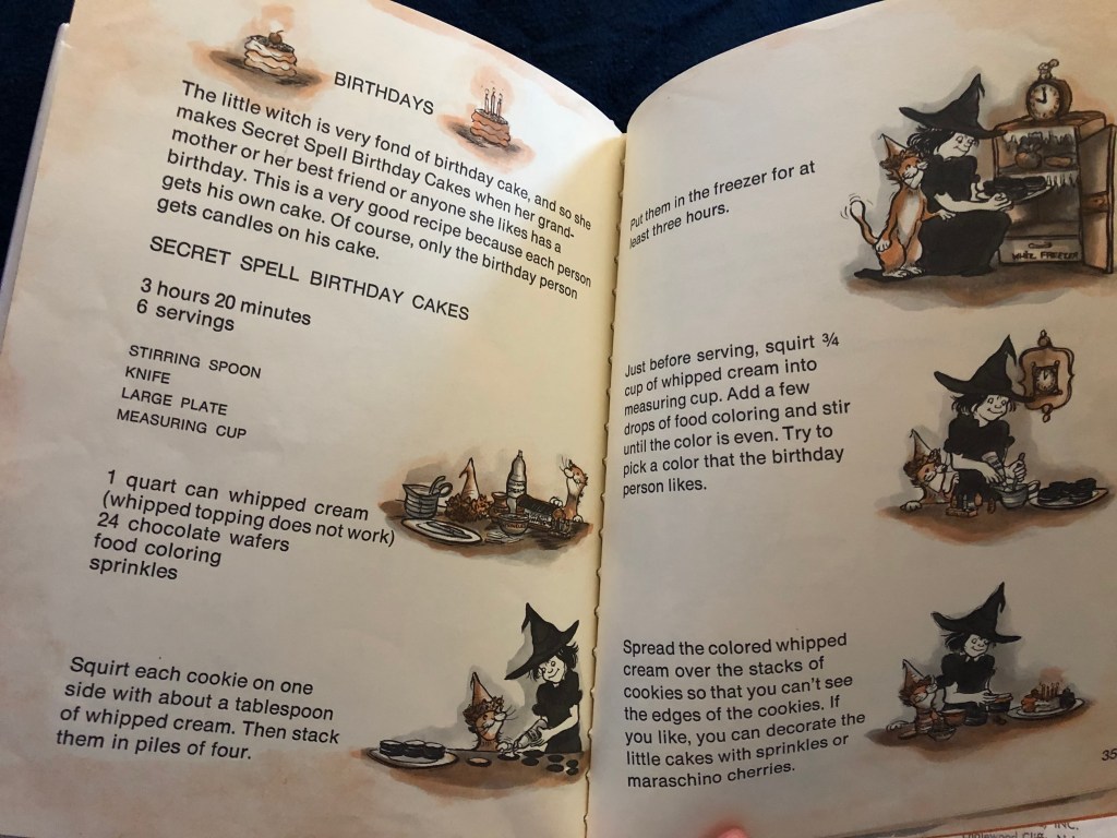 In the section about birthdays, there is only one recipe for little birthday “cakes.” The “cakes” are actually chocolate wafer cookies, stacked with whipped cream, put in the freezer, and covered with more whipped cream. This is basically an old-fashioned icebox cake, a popular dessert from decades past. It’s not really a cake, but it does sound like a fun birthday treat!