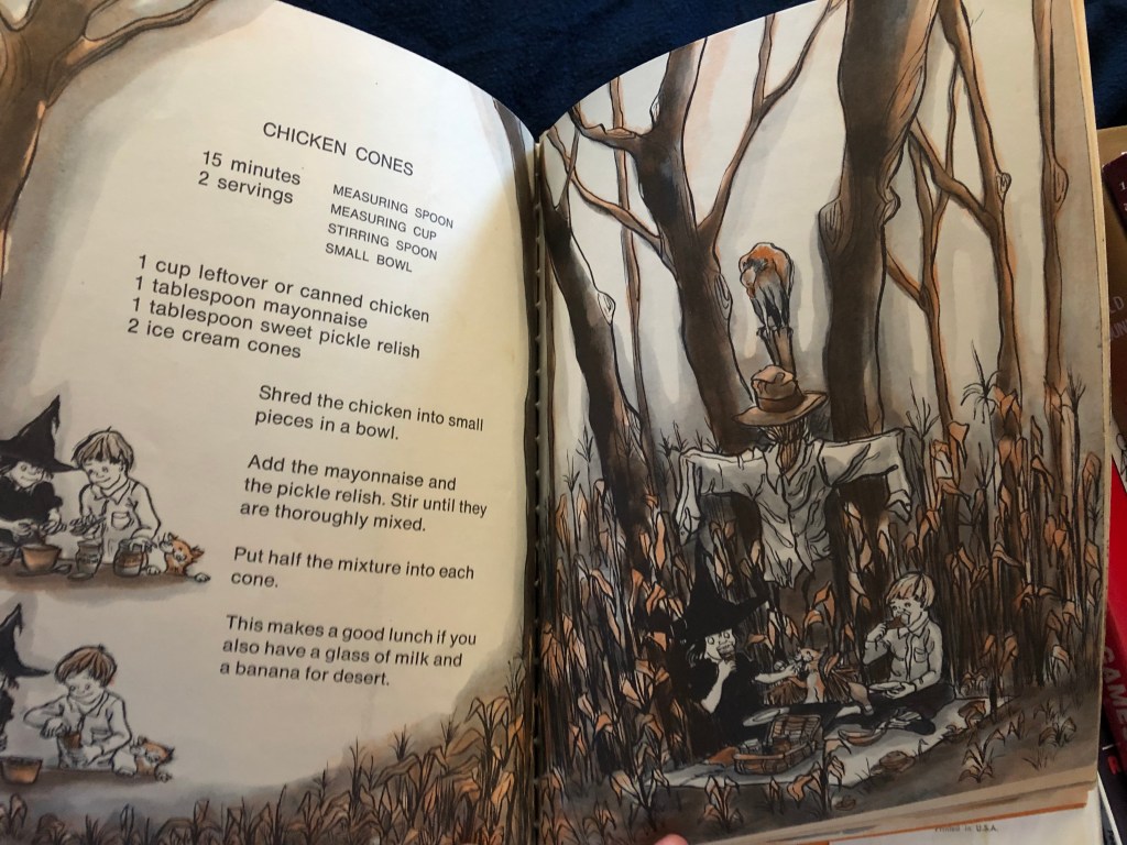 I was more interested by the Halloween recipes and the Chicken Cones, which are listed in the lunch section. The Chicken Cones reminded me of the Tuna Cones recipe that I saw in a Klutz cookbook for children. The only difference is that this recipe uses a simple chicken salad in an ice cream cone instead of tuna salad.