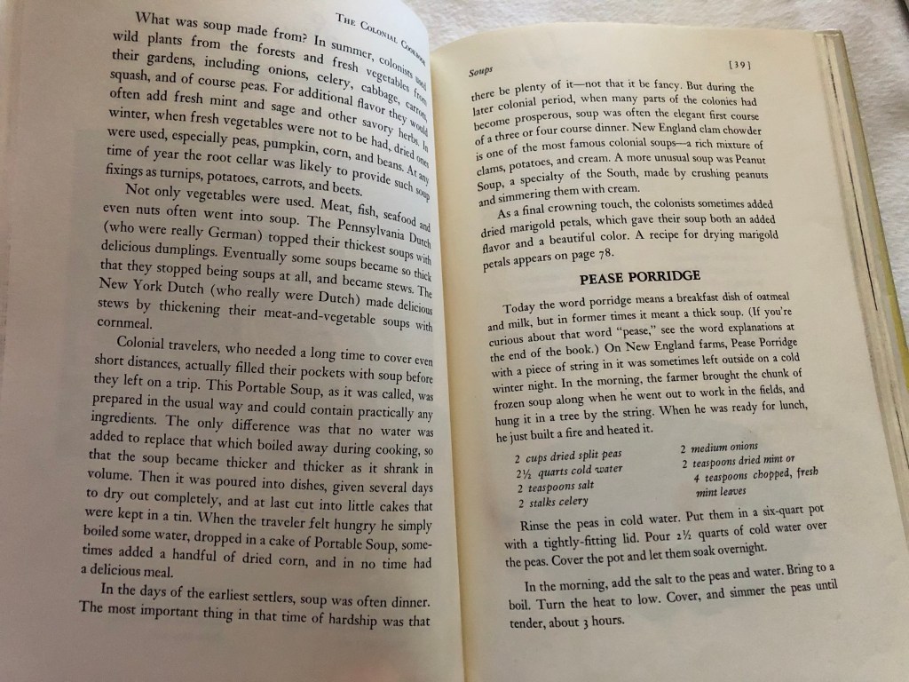 The book provides a variety of recipes, organized by type. Most of the recipes in the book do not look too difficult, although some call for more unusual ingredients, like rosewater. You can still find it, although I’ve usually seen it at specialty cooking stores or import stores. The categories are soups, meat, poultry, seafood, vegetables, puddings, breads, sweets, drinks, and sauces and relishes. Not all of the recipes look like things that would interest modern children. I don’t imagine that many children would be excited at the idea of making Scalloped Oysters, for example. (Seafood was an important food source for early colonists.) Even though children might recognize Pease Porridge from the rhyme, I’m not sure that a thick pea soup would be something that they would be excited to eat, either. Hasty pudding is mentioned in the song Yankee Doodle, but the recipe itself is a little bland. The book does mention that you can flavor it with maple syrup, and there are other cornbread pudding recipes that contain spices and sweeteners in the book.