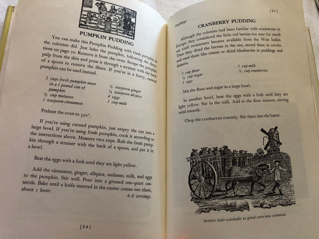 The book explains the different ways that colonists would prepare pumpkin. You can bake it and eat it in pieces with syrup, molasses, honey, or cream. The book explains how to cook it, and it also provides a recipe for Pumpkin Pudding, which can be made with either fresh pumpkin or canned pumpkin. I haven’t made it yet myself, but from the recipe, it reminds me of a pumpkin pie without the crust: