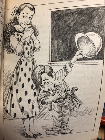 As the children try to figure out if the construction crew might really be elves, they decide to ask the department store Santa more about elves. The kids debate about the department store Santa really being Santa, and the Santa makes a comment about how he’s been meaning to pay a visit to their school, seemingly ignoring a previous book in the series, when Santa apparently became their school’s janitor. However, later in the book, Howie refers to the “new janitor who keeps turning down the heat,” referring to what happened in the previous book, which is confusing. The department store Santa explains that his elves like to fix things, and they are particularly concerned with fixing people who can’t get along, hinting that the arguments over the school’s playground are what brought the elves to the school. Santa’s advice is for the children not to worry because the elves will disappear on their own “when the time is right.”