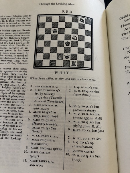 The chess game in Through the Looking Glass is meant to be part of an actual chess game with real moves that can be mapped out on a board. The game and the moves in the story are explained in the preface of my copy of the book. Alice begins as a white pawn in the game, but when she reaches the other side of the board, she becomes a queen, which is part of the rules of chess – pawns that successfully reach the opponent’s side may be exchanged for other pieces. The colors of the chess pieces in Alice’s game are red and white instead of black and white because red and white are old traditional colors. Although black and white are common today, many different color combinations have been used, and the red and white combination dates back to the Middle Ages.