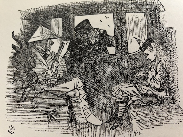 Pawns get to move two squares on their first turn, so Alice gets to go by train. In the train carriage, Alice meets many strange characters, including a gentleman dressed in white, a Goat, a Beetle, and a Gnat, who keeps whispering in her ear and suggesting that she make jokes based on puns. Through the Gnat, Alice meets other strange insects, like the snap-dragon-fly, the rocking-horse-fly, and the bread-and-butterfly. The Gnat tells Alice that the creatures in the woods don’t have names, and when Alice goes through the woods, she temporarily forgets her name, getting it back again on the other side.