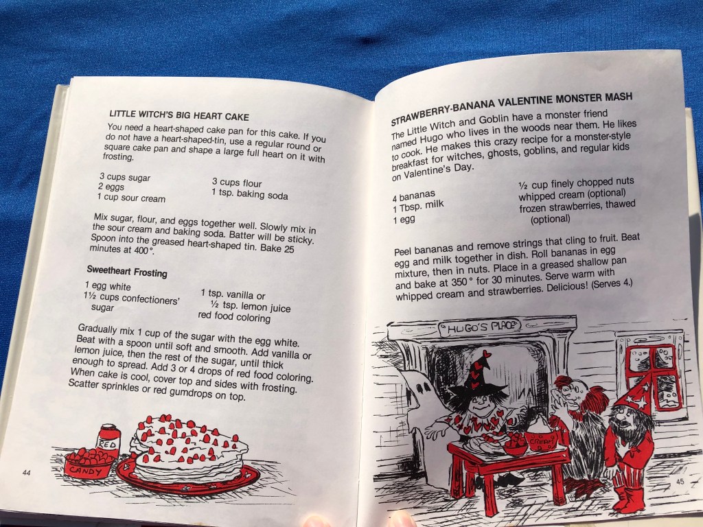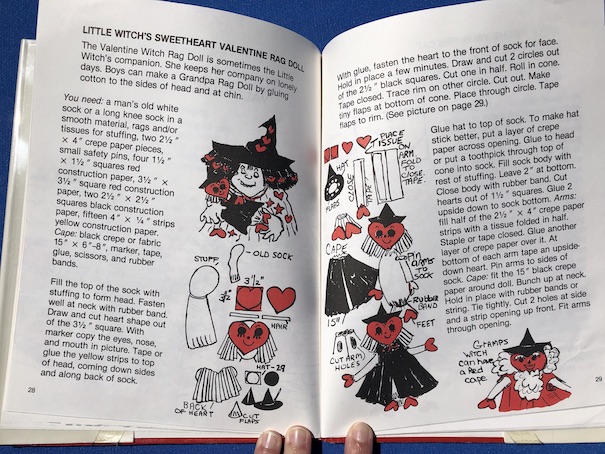 Like other Little Witch Craft Books, this one gives holiday-themed craft instructions, party tips, and recipes. The book starts out with a brief explanation about the purpose and origin of the Valentine’s Day holiday and then gives a section about Valentine-themed crafts. Some of them also relate back to the witch theme of our craft hostess, like Valentine-themed witch hats, which is a little odd, but fun.