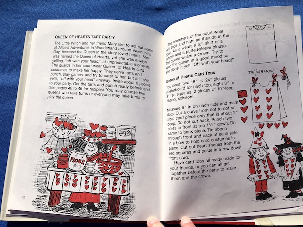 Under the party suggestions, the book recommends having a Queen of Hearts Tart Party for an Alice in Wonderland tie-in. It gives instructions for making playing card costumes that are kind of like sandwich board signs.