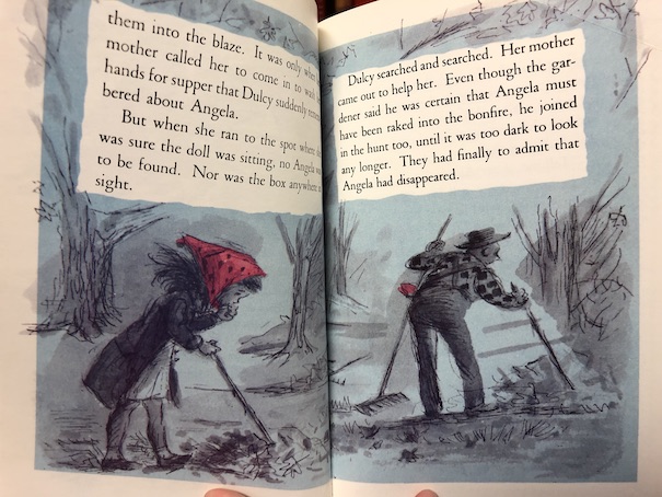 Then, one day, an elderly friend, Mrs. Primrose, gives Dulcy a doll named Angela. Dulcy likes Angela, although her immediate thought is that Angela would be even better if she had dark hair instead of blonde, finding a tiny fault as she always does. But, by accident, Dulcy loses Angela on the way home. She sets Angela’s box down when goes to help rake leaves into a bonfire, and when she goes to retrieve her, she can’t find her.