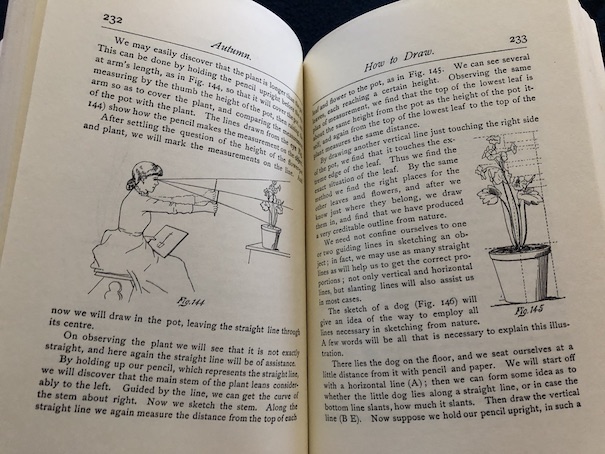 Summer provides many opportunities for outdoor activities. There are tips for holding various types of picnics and decorating a seaside cottage, and there are suggestions for using plants in art and making dolls out of corn husks and flowers. However, summer is also very hot, and in the days before air conditioning, people would have also wanted ways to relax and keep themselves as cool as possible in the heat. The summer section of the book has instructions for making fans and hammocks and playing relatively quiet games.