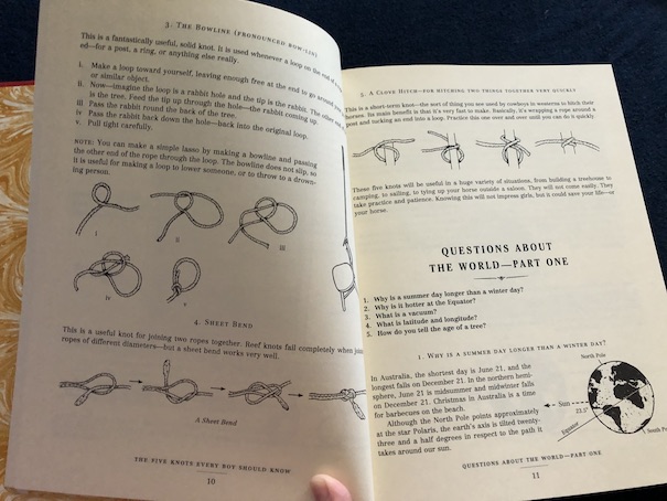 Aside from random, useful life skills, there is also academic information in the book that would be useful to school, like standard and metric measurements, the sections about how grammar works, the origins of words, Latin phrases, quotes from Shakespeare, the Ten Commandments, and poems that boys should know and books that boys should read.