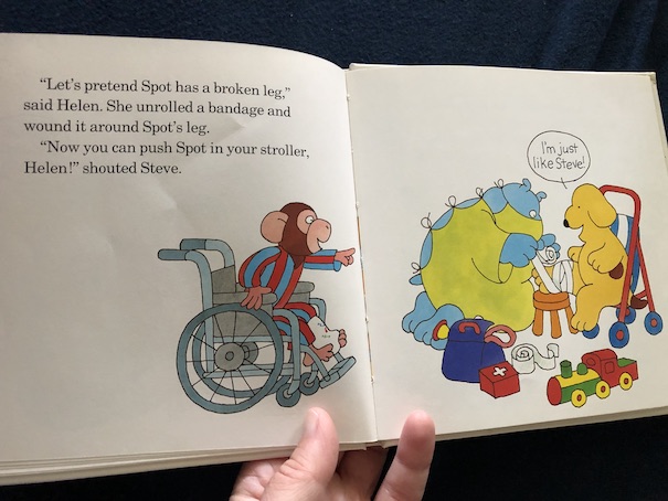 Spot’s friend Helen decide to play doctor, and she puts a bandage on Spot’s leg, as if his leg is broken, like Steve’s. They start pushing Spot around in a stroller, like it’s a wheelchair.