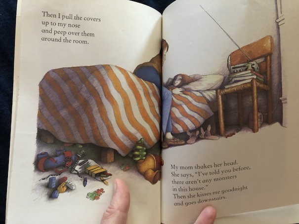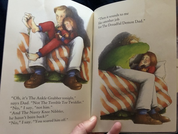 When she misses her jump back into bed and lands on the floor, her father comes in to see what’s wrong. Her father has scared off monsters for the little girl before, so he sticks his head under the bed to scare off the Ankle Grabber, too.