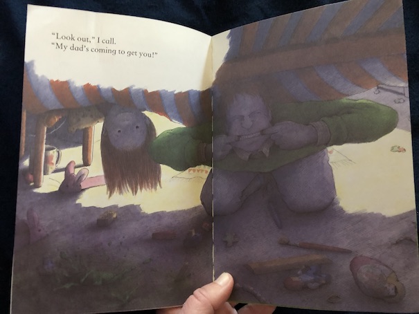 This book is part of the Creepies series, where children have fun imagining monsters. The stories are about the power of imagination and the fun of being a little scared. Sometimes, even though the children know that they made up the monsters themselves, they also get scared of their creations. Books in this series can be good for talking to children about how their imaginations can run away with them and scare them, but I’d use caution when introducing them to very young children because they can make nervous children more nervous by feeding their imaginations. These books would probably be best for ages seven and up. Fortunately, even when the kids’ imaginations run away with them, the stories always end in reality, and the hero of this story is … Dad!