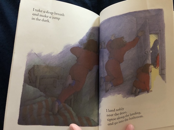But, as is inevitable when you’ve got a monster under your bed, the girl realizes that she has to go to the bathroom. Getting in and out of bed without being caught by the Ankle Grabber is a tricky proposition. The girl tries to get into and out of bed by jumping so that she can avoid the monster.