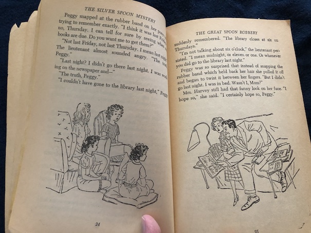 You just know that there’s going to be trouble with Peggy trying to sell a story that everyone knows didn’t happen, but what actually happens is even stranger. After the girls sell their paper with the spoon theft story, Peggy gets home to find a policeman, Lieutenant Peters, waiting for her with her mother. Lieutenant Peters wants to talk to Peggy about the robbery at the library because it turns out that the very night when Peggy was writing her big fictional scoop about silver spoons being stolen from the library, someone was in fact stealing silver spoons from the library, and this thief apparently did it the way Peggy described in her story. Lieutenant Peters wants to know everything that Peggy knows about the theft, and he won’t believe that Peggy wasn’t there to witness it because her description of what happened is so accurate. She even has a description of the thief in her story. Since the theft happened in the middle of the night, Peggy points out that she was asleep in bed, but even Peggy’s mother isn’t sure that Peggy didn’t sneak out. When Peggy’s friends show up at her house, Lieutenant Peters questions them too and comes to the conclusion that Peggy and maybe also her friends stole the spoons themselves to make their story true. Lieutenant Peters says that they’ll be forgiven if they give the spoons back, but the girls can’t do that because they don’t have them.