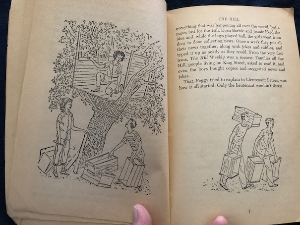 The girls are offended at suddenly being shunned by the boys, so they decide that they need to have some special project, something that will show the boys that girls are just as good as they are and that the girls don’t have to rely on the boys to have some fun. They decide to start a neighborhood newspaper, writing about local events and having fun stuff, like jokes. The newspaper is a success, and adult neighbors buy copies. Then, the boys decide to start a competing newspaper themselves. One of the girls, Peggy, is upset because she’s sure that the boys’ newspaper will be more successful. Some of the boys are older than the girls so they might write better, there are more boys than girls in the group so they have more people to gather news and sell papers, Davey is better at drawing cartoons than the girls are, and worst of all, the boys splurged to buy a hectograph, which uses a gelatin substance for making copies of writing and drawings (as in this video) and will allow the boys to print papers by the hundred (“hecto” means one hundred, and that’s how many copies a hectograph makes at a time). (This is before home computers, so the characters have to rely on manual printing methods. People used hectographs to make copies before modern copy machines, but modern hectographs still exist, and some people use them for artwork or tattoo stencils.)
