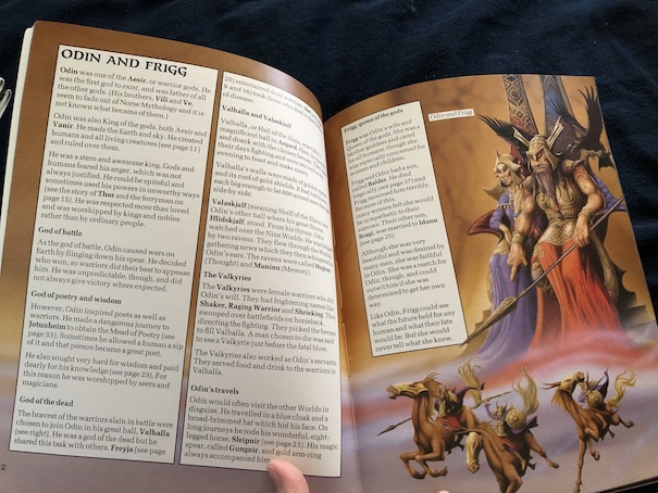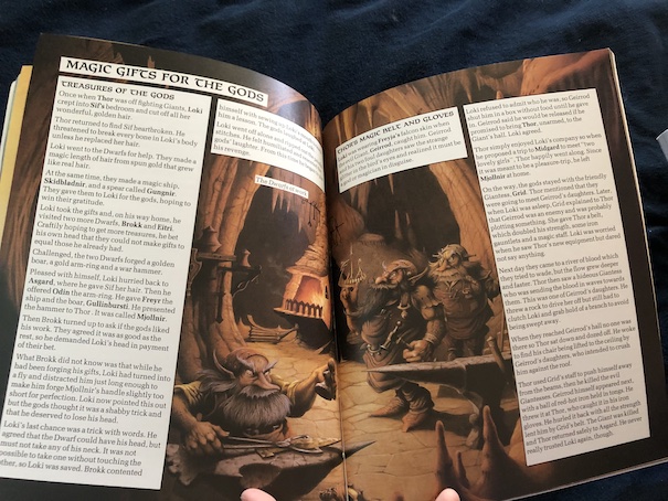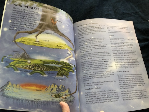 The book has pages dedicated to specific gods and goddess, explaining their histories and roles in Norse mythology. Odin, for example, was the king of the gods, who created the world and humans and was the father of the other gods. His wife’s name was Frigg, and she was a mother goddess figure. Thor was the thunder god and the god of law and order. Unlike other gods, he mostly relied on his strength instead of magic or tricks, but he did have magic weapons, including his hammer, Mjollnir, which would always strike its intended target and return to Thor after. Freyja was one of the fertility gods, and she was the goddess of love and beauty. She later also became a goddess of death and was responsible for starting wars among humans. Loki technically wasn’t a god because his parents were fire-giants, not gods, but he was a close friend and sworn brother to Odin, so he was able to live in Asgard, too. Loki is known for being a trickster figure.
