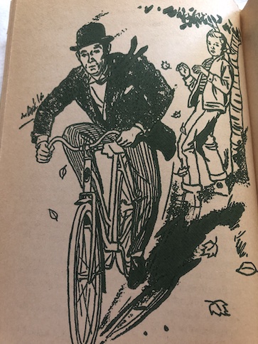 When Jimmy is on his way to the Willoughby estate to meet Brains there after his paper route, he is almost hit by Mrs. Willoughby’s Rolls-Royce … but there’s nobody driving it! Yet, somebody must be controlling it somehow because the car deliberately swerved toward Jimmy and then made a turn in the road. Just after the Rolls-Royce almost hits Jimmy, Mrs. Willoughby’s British butler and chauffeur, Frothingham, comes along on a bicycle, in pursuit of the car. He falls off the bike, and Jimmy helps him. Frothingham explains that he’s got to catch up to the car. He says that it was parked in the Willoughby driveway and that the hand brake was set, and he can’t understand what happened. When Jimmy says that maybe the brake just failed, Frothingham says that he doesn’t think it’s likely because it’s a good quality car and well-maintained. When Brains comes along, Jimmy explains the situation to him, and the two of them follow Frothingham to where he has found the Rolls-Royce parked and apparently undamaged.