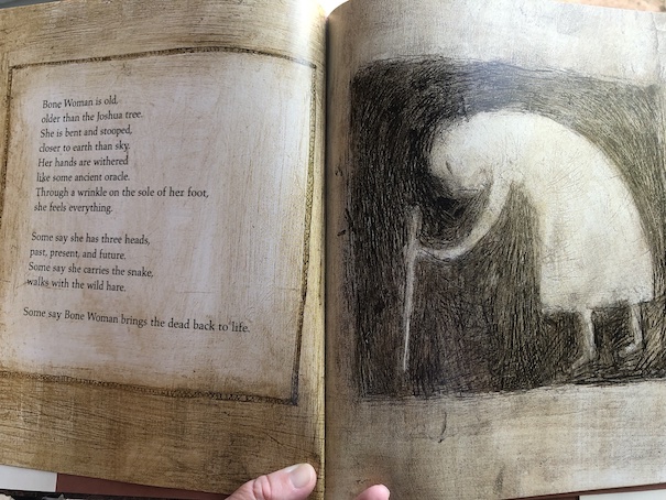 This is one of those picture books that I think would actually be appreciated more by adults than by children. The poetry and art style seem more sophisticated than the styles that children seem to prefer. Most of the pictures are not very colorful, using a lot of grays and browns and black, although the art style is unusual and fascinating, looking like paintings and drawings scratched into rock.