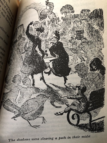 Hallowe’en – On Halloween, as the children are heading home with Mary Poppins with nuts and toffee apples, they meet the strange Mrs. Corey and her tall daughters. The children are told to be careful of stepping on shadows and that they should take care of their own shadows so they don’t run away. Mary Poppins hurries the children home and to bed, but the children find leaves that seem to be invitations to some kind of party. The children look outside and see shadows without people in the garden. The children follow the shadows, including their own, to the park. There, they see the shadows of everyone they know and even nursery rhyme characters. Mrs. Corey, her daughters, and Mary Poppins are there, and they explain that it’s the night before Mary Poppins’s birthday, and that’s what the celebration is about. They all dance with the shadows until Mrs. Boom arrives, upset, because her husband is distressed that his shadow is missing. Soon, other people also arrive to reclaim their shadows.