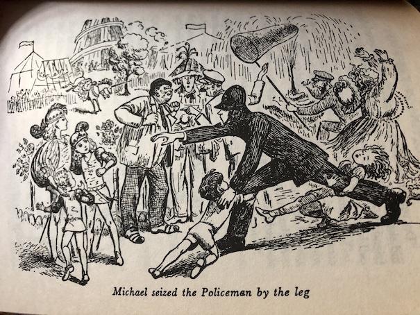 The Park in the Park – The children are playing in the park on a hot day. Jane is making little figures out of plasticine and a little park for them all. Michael is hungry, and the baker figure comes to life and gives him pie. The children get to know the other figures, and Jane is amazed that the characters have lives that she didn’t create for them. The figures don’t seem to remember that Jane made their little world, and Jane and Michael are astonished to realize that they have now become child-size in the little park she created.