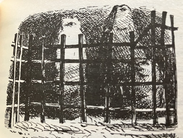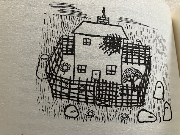 Among the things in the workbox, Marianne finds an old pencil. She immediately likes the look of the stubby old pencil and has the sense that it would be fun to use for drawing, so she picks up her drawing book and begins to draw a picture of a house with a fence around it and some flowers. Marianne’s drawing isn’t particularly great, not as good as what she pictured in her mind’s eye when she started it, but it is the start of something very special.