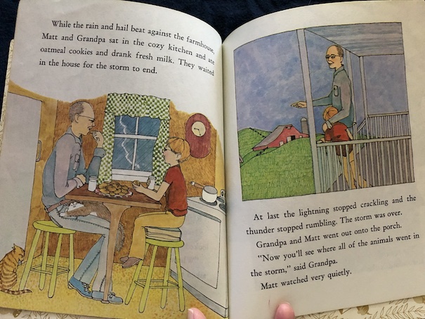 I like this story because it’s very calm. I think it could make a good bedtime story for young children. Although the boy in the story is concerned about the animals and where they will go during the storm, the animals are never in any danger. The grandfather knows that the animals will all be fine, and he reassures his grandson that they all have a place to go. It’s reassuring that the storm is natural, the animals know what to do when it happens, and the boy sees that everything is fine. The story ends with the boy and his grandfather watching the sun come out after the storm.