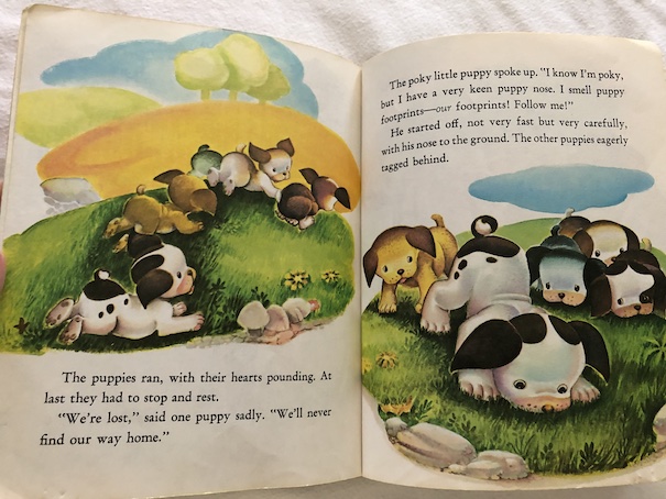 Then, the Poky Little Puppy realizes that what they really need to do is sniff for their own smell so they can retrace their steps home. Sniffing for their own trail works, and the puppies get home in time for dinner!