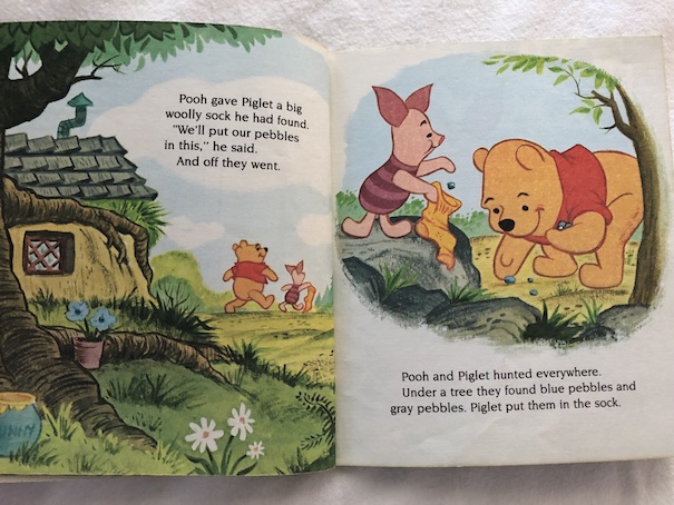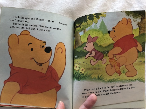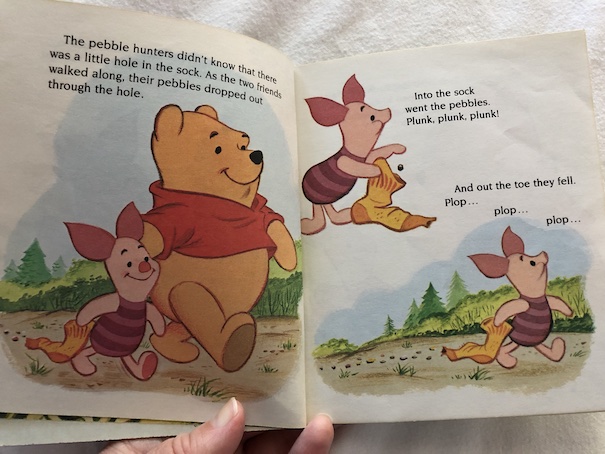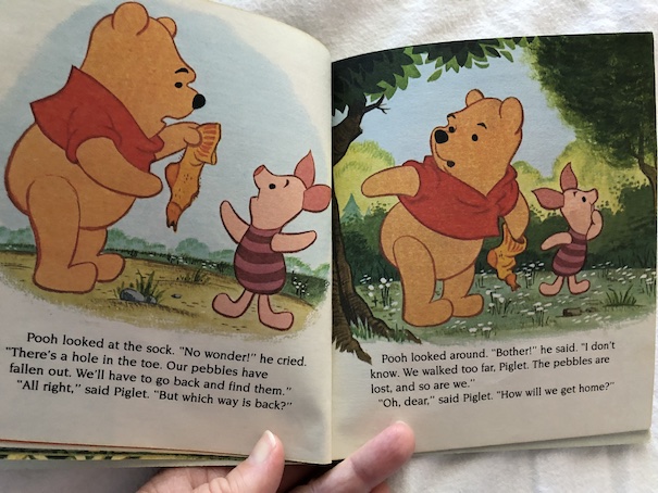 Fortunately, Winnie-the-Pooh realizes that they can follow the trail of pebbles they’ve lost to find their way back home. They tie a hole in the sock to stop the pebbles they’ve collected from falling out again, and they follow their pebble trail, picking up the pebbles again on their way home.