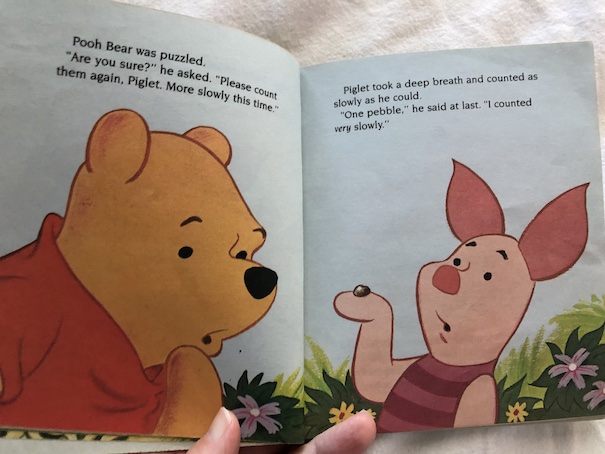 This is a cute and fun story where Winnie-the-Pooh and Piglet discover that their mistake in losing the pebbles they’ve been collecting is actually a stroke of good luck because their trail of dropped pebbles helps them find their way home when they’re lost. This little picture book was a favorite of mine and my brother’s when we were little, and my family still likes to jokingly quote Piglet when he realizes that there’s only one pebble left, and Pooh asks him to count again, slowly, just to be sure: “One pebble. I counted very slowly.”