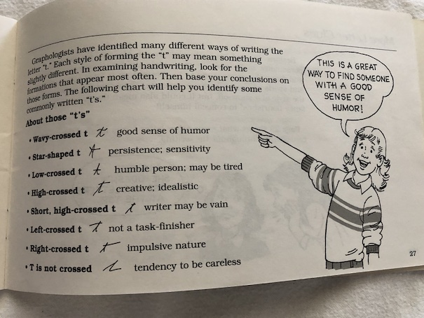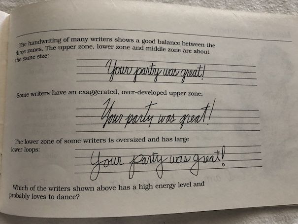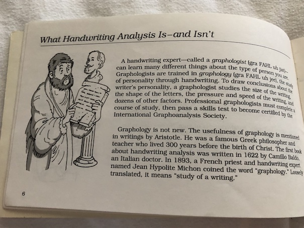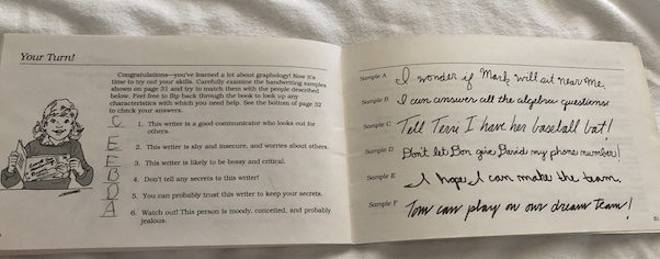 I did notice (even as a child, I think), that some of the personality traits they point out in their sample handwriting analysis comparisons could be just as easily deduced from what the person says as what their handwriting looks like. I think that’s because the author knew what personality traits she wanted to point out and made sure that the samples were written in character.