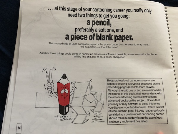 I remember buying this book at a Scholastic book fair back in the early 1990s. I didn’t draw a lot of cartoons, but I found the tips in this book to be helpful for drawing in general. The book begins with the useful advice: