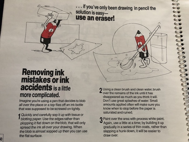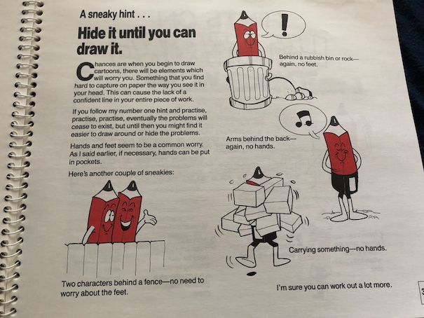 One of the tips that I’ve appreciated is the advice that it’s okay to hide things that you can’t draw well until you’ve learned to draw them better. For example, if you don’t draw hands well, you can just have characters hold their hands behind their backs. There are also tips for fixing mistakes along the way.