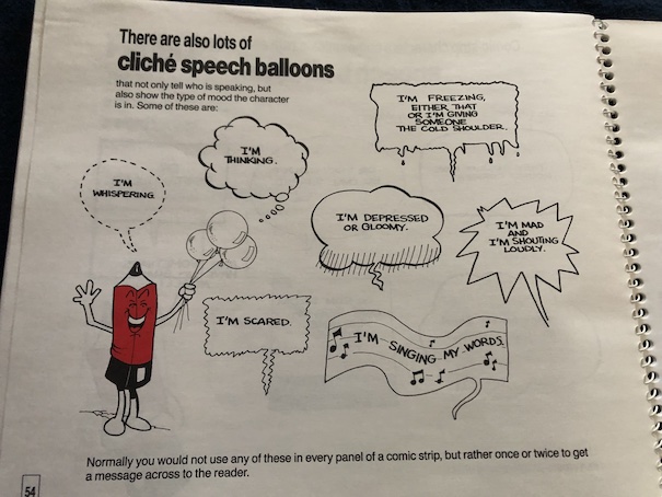 The book also explains how to plan and plot a comic strip. It discusses considering your audience, choosing the types of characters you want to use and giving them personalities, and developing your presentation style with different types of panel borders and speech balloons. It also explains the cliches that cartoonists use, certain common visual signals that cartoonists use to express certain types of speech or events or show movement. The light bulbs over a character’s head when they have an idea is an example of a cartoonist cliche.
