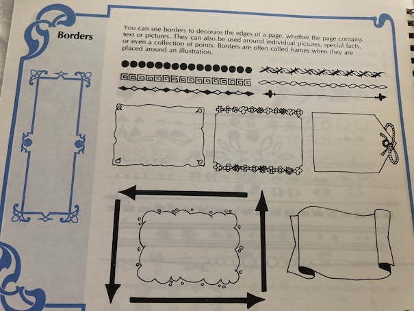 I couldn’t find this particular book online, but a couple of related books by the same author are available to borrow and read for free online through Internet Archive. I think I also used to own The Lettering Book of Alphabets, probably purchased at the same time as this book, and that inspired my alphabet lettering phase. The Lettering Book Companion is a companion book to The Lettering Book, and it particularly focuses on decorative borders.