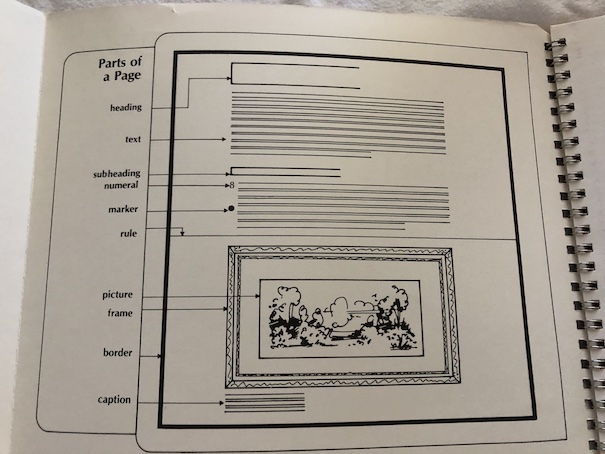 The front and back flaps of the book fold out, and there is a chart of the parts of a page, a couple of grids like those used for planning lettering styles, and a glossary of terms used in the book.