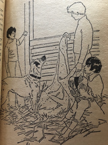 At the riding school, George has developed a rivalry with another girl called Henry. Henry’s real name is Henrietta, like George’s real name is Georgina, and like George, Henry likes to dress and act like a boy. However, rather than bonding over their shared interests and styles, George and Henry resent each other. (George makes a big deal of not liking to be a girl and wanting other people to look at her and refer to her as a boy. I’ve wondered whether the implication is that she’s actually transgender, without using that word to describe her, or if she’s merely a tomboy who things girl things are sissy stuff. Enid Blyton’s books are often full of the implication that boys are tougher and braver than girls, and it seems to be a mark of praise for a girl to be like a boy. In this particular book, it seems like both George and Henry are trying hard to be “not like other girls“, and the reason why they resent each other is that they’re both disgruntled to realize that at least one other girl is like them, making each of them seem less exceptional. They each seem to feel like the other is horning in on their shtick.) In spite of the rivalry between George and Henry, the other children like Henry. Eventually, George and Henry settle their differences. Henry joins the other children on some of their rides and explorations.