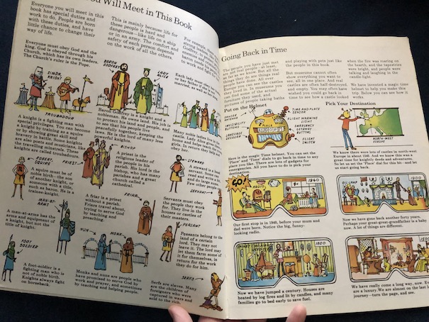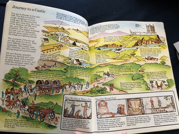Our trip back in time begins with a road journey to a castle. Readers see how people in the Middle Ages traveled. The journey page also explains how the Romans built the roads Medieval people used centuries earlier, which is a good historical segue because the period that we call the “Middle Ages” begins with the fall of the Roman Empire and the withdrawal of Roman forces from the furthest parts of its empire. On some pages of the book, there are extra panels at the bottom of the page with additional information, and the first set explains how we know what people would find if they were able to travel back in time to the Middle Ages, explaining how historians have gleaned information from Medieval writings and pictures and from studying physical objects, like buildings and tools.