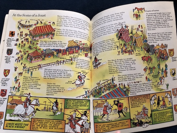 There are a couple pages about knights and how a boy would train to be a knight. There are also pages about jousts, the Crusades, and attacking and defending a castle.