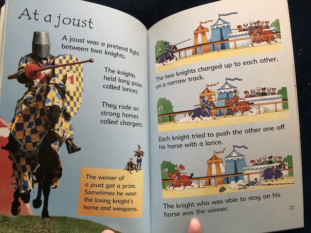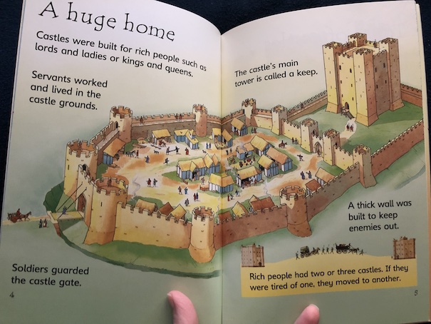 This nonfiction picture book for kids is part of the Usborne Beginners series, originally published in Britain. There are other books about castles, knights, and life in the Middle Ages from Usborne, but this book in particular, like others in its series, is a simplified version meant for beginning readers. The book is recommended for ages 4 and up.