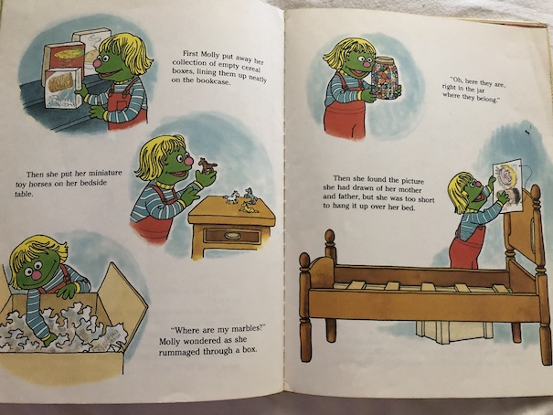 Molly and her parents are moving into a new apartment on Sesame Street, but Molly feels uncomfortable because nothing in this new neighborhood feels familiar. Her new room is still bare and doesn’t look or feel like home. Molly’s parents reassure her that it will feel more like home once all of her belongings are unpacked.