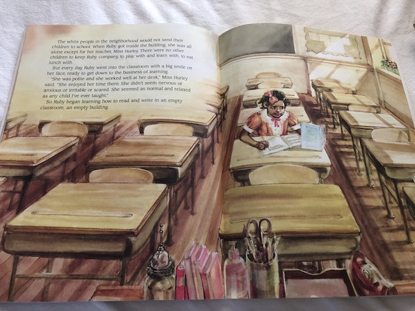 Parents in the area refused to send their children to school so they wouldn’t be in the same classroom with a black child, so Ruby Bridges was literally in a class all by herself. Her teacher, Miss Hurley taught Ruby in an otherwise empty classroom. Miss Hurley was surprised at how Ruby was able to keep a good attitude in spite of the angry protestors and the lack of other children.