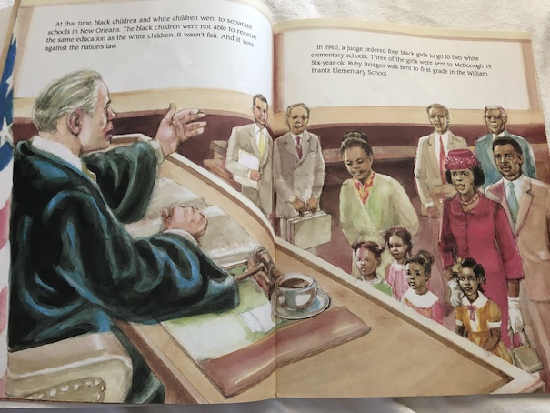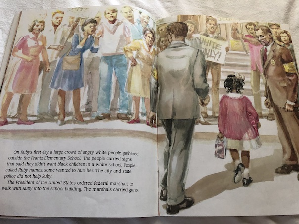 The book explains briefly that schools were segregated at the time, and that black children were not given an education that was equal to what was offered in white schools. Because the book is for children, it doesn’t go deep into detail about the Civil Rights Movement and desegregation or exactly how Ruby Bridges’s family became involved. (Ruby was selected as one of the children because she passed a test for academic aptitude, showing that she could keep up with a class of white children, who had better early education.) It simply says that, in 1960, a judge decided that four young black girls would be sent to schools that had been for just white children and that six-year-old Ruby Bridges was one of them.