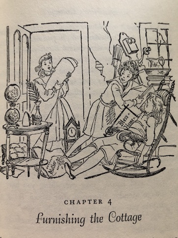 The girls’ parents completely support them playing in the playhouse because it does mean less noise and mess at home, although they refuse to allow the girls to stay in the cottage overnight for safety reasons. They let the girls have some old furniture to furnish the house, including chairs that are missing legs, beds that sometimes have the slats falling out of the bottom, and six clocks, four of which don’t work. The little cottage soon begins to look cheerful and lived-in, although the girls have to warn their visitors about which chairs are unsafe to sit in.