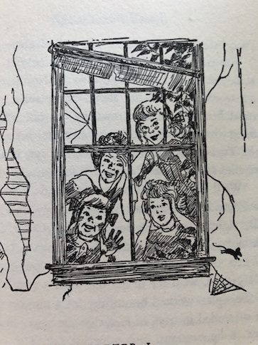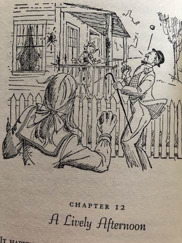 Mr. Black, the church warden, sees the girls looking at the cottage and asks them what they’re doing. They explain that they want to rent the cottage so they’ll have somewhere to play. They tell him how Marjory’s aunt won’t let her make paper dolls because cutting paper in the house makes a mess, and Bettie says that her brothers like to play Indians and pretend to “tomahawk” her dolls. (The books in this series sometimes get criticism for racial stereotypes and language, and this is one example. I do understand the part about brothers and dolls, though. My older brother once held one of my dolls for ransom when we were kids.) Not having any money to rent the cottage, the girls offer to clean it up in exchange for being allowed to use it. Mr. Black knows that some of the neighbors have been complaining about how the place has been overgrown with weeds. The church could hire someone to take care of the weed problem, but that would cost money, and they don’t have a lot to spare. Mr. Black tells the girls if they’re willing to pull all the weeds, he’ll let them play in the cottage all summer. The girls aren’t enthusiastic about pulling weeds, but they’re very enthusiastic about having their own playhouse, so they agree to do it. Mr. Black says that he’ll turn over the cottage key to them after they’ve pulled the weeds.