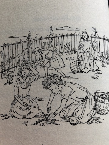 While the girls are pulling weeds, some of them play pretend games, like they’re fighting soldiers or Indians (as in Native Americans, another one of the objectionable points), and finally, they get the job done. Mr. Black is satisfied with the job they’ve done and pleased with their willingness to sow grass seeds and flowers where the weeds once were, so he gives them the key to the cottage for the summer.