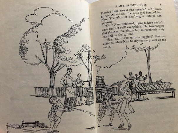 Ah, so you’ve started the Bobbsey Twins! I have the original 1904 edition if you want to borrow it. It is called “Merry Days Indoors and Out”, and the story is COMPLETELY different than the revised edition! I grew up with these books as I had several copies printed before WWI (funny to think that today, those books are older than anyone living)